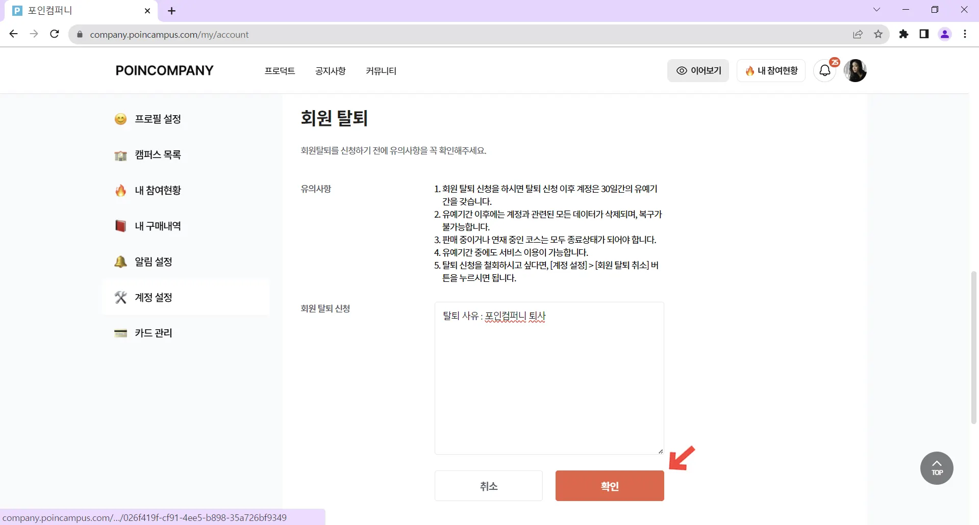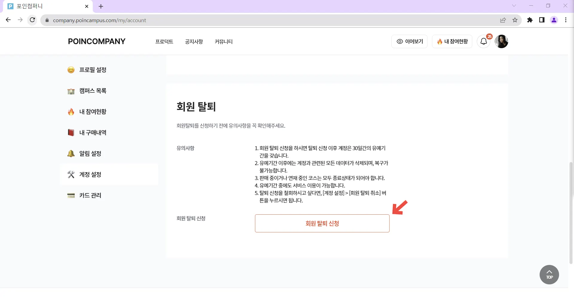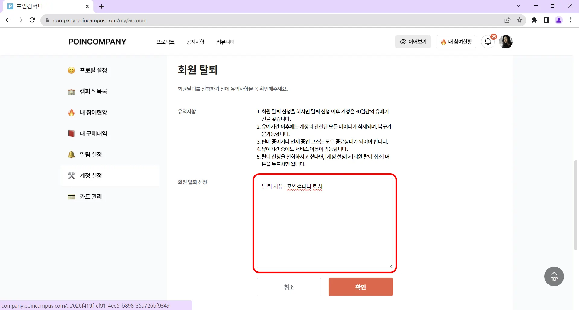 캠퍼스에서 탈퇴 신청을 할 수 있습니다.