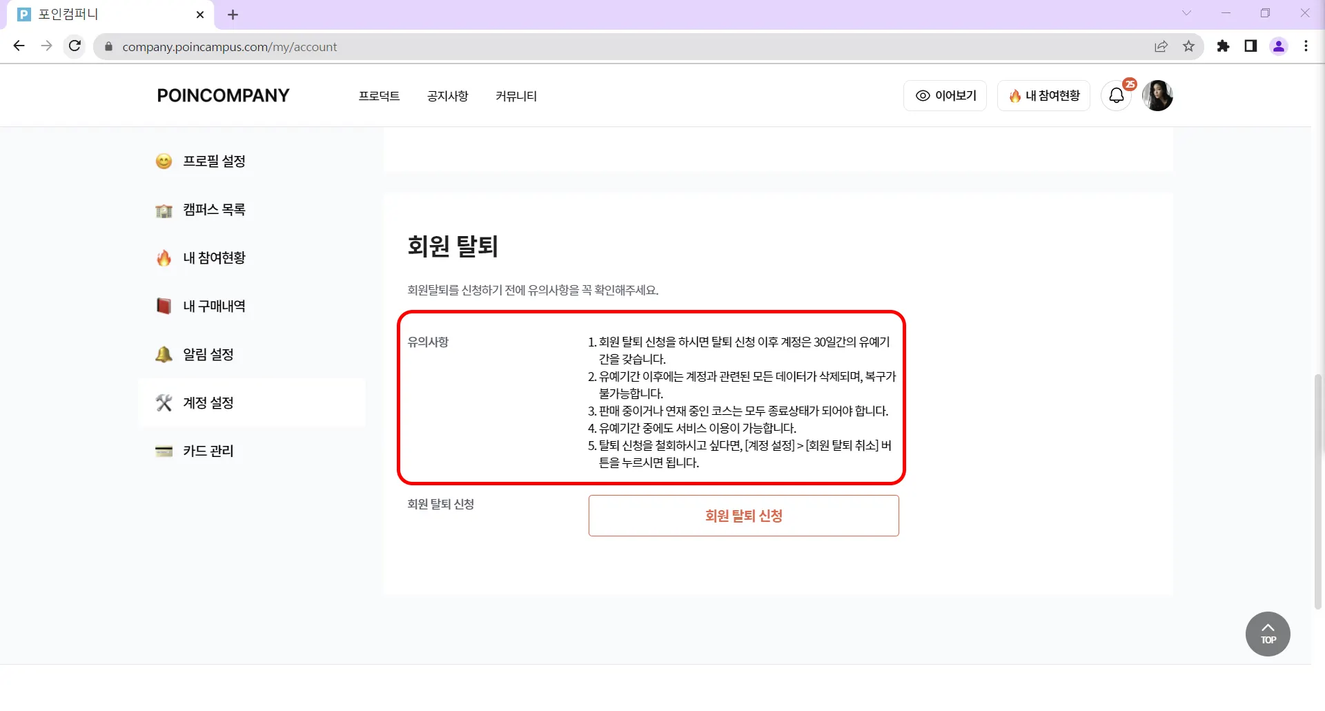 유의사항 (5.) 탈퇴 신청을 철회하고 싶다면, 계정 설정 > 회원 탈퇴 취소 버튼을 눌러 주세요.