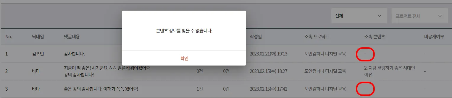 댓글이 작성된 콘텐츠가 삭제되면 소속 콘텐츠에 (-)로 표시되며, 댓글의 상세 내용을 확인할 수 없습니다.