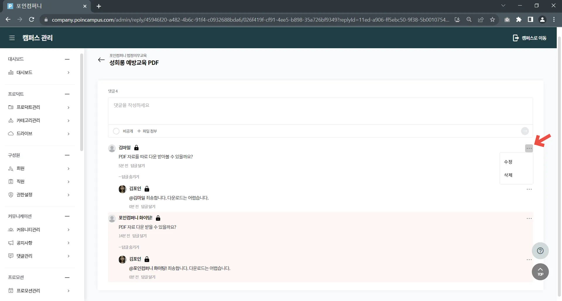 소속 콘텐츠의 모든 댓글을 확인하고, 회원이 작성한 댓글에 답글을 작성할 수 있습니다.