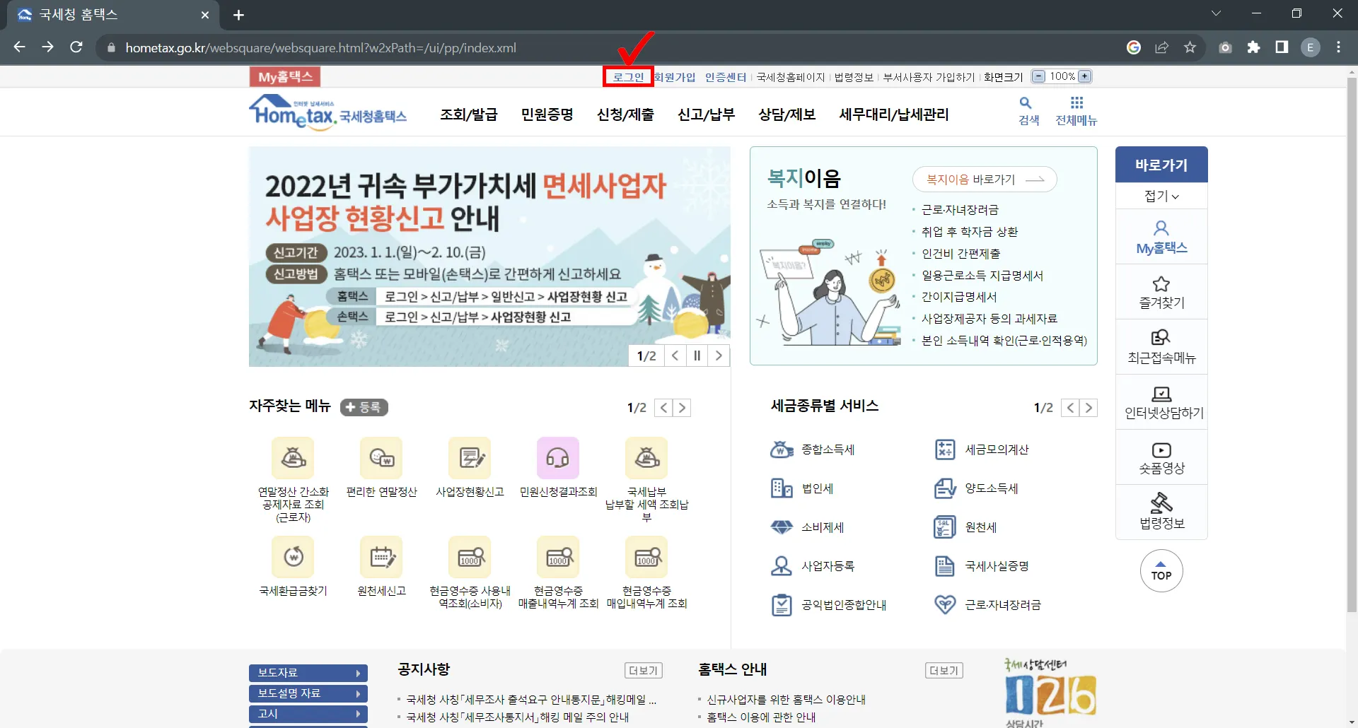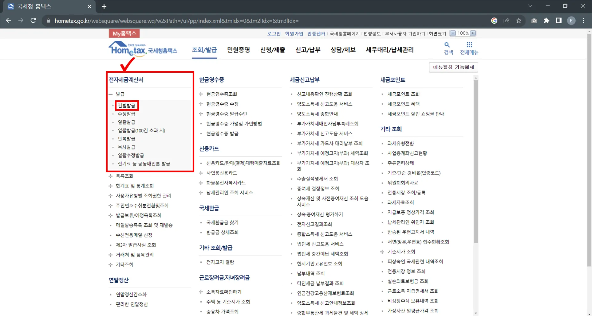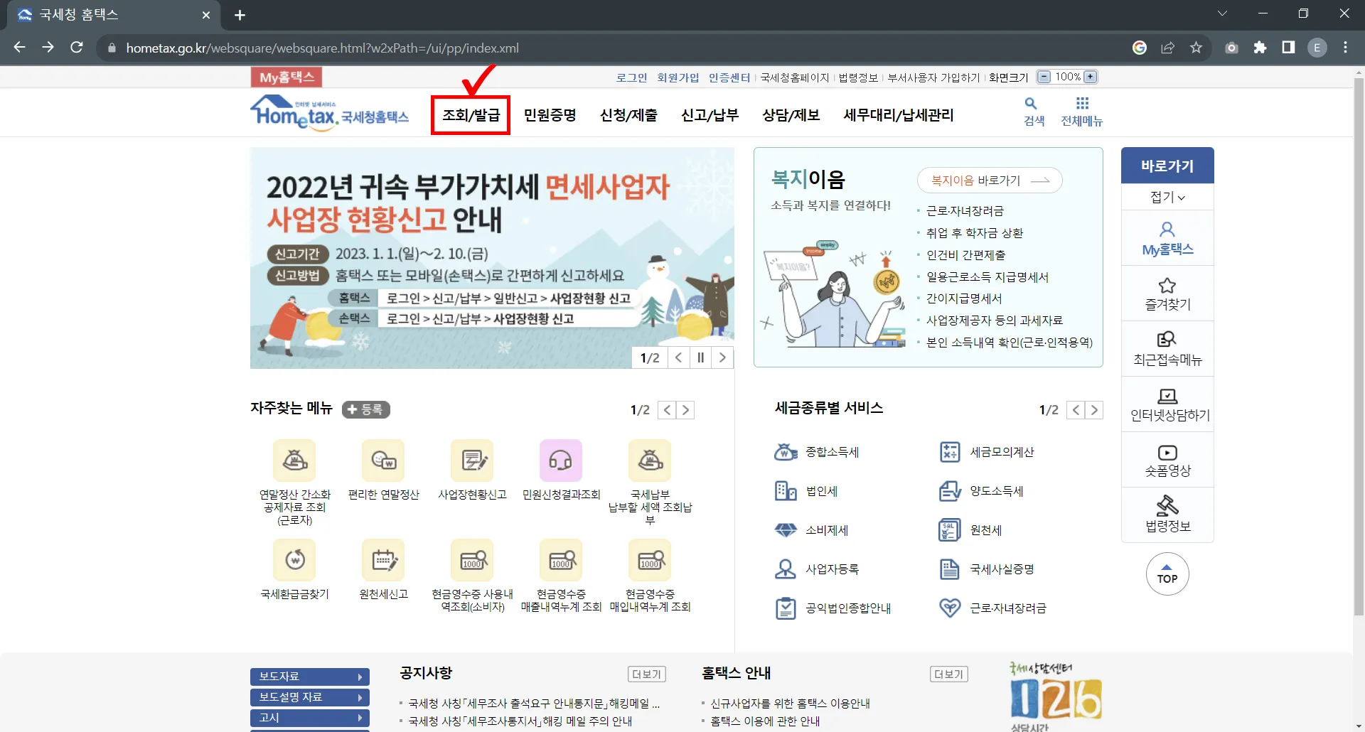 홈택스 화면에서 조회/발급을 클릭해 주세요.