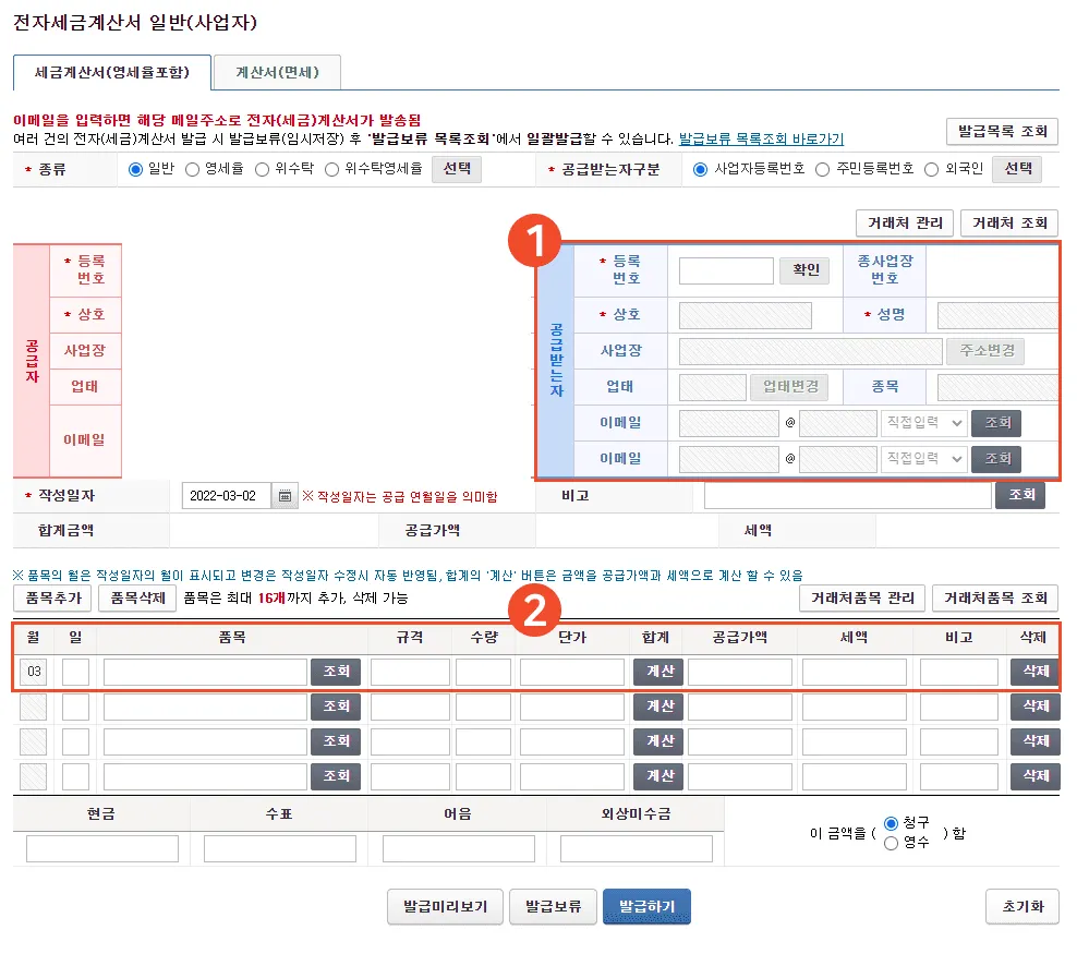 (과세)사업자 : 공급가액, VAT 입력 후 전자세금계산서 발행