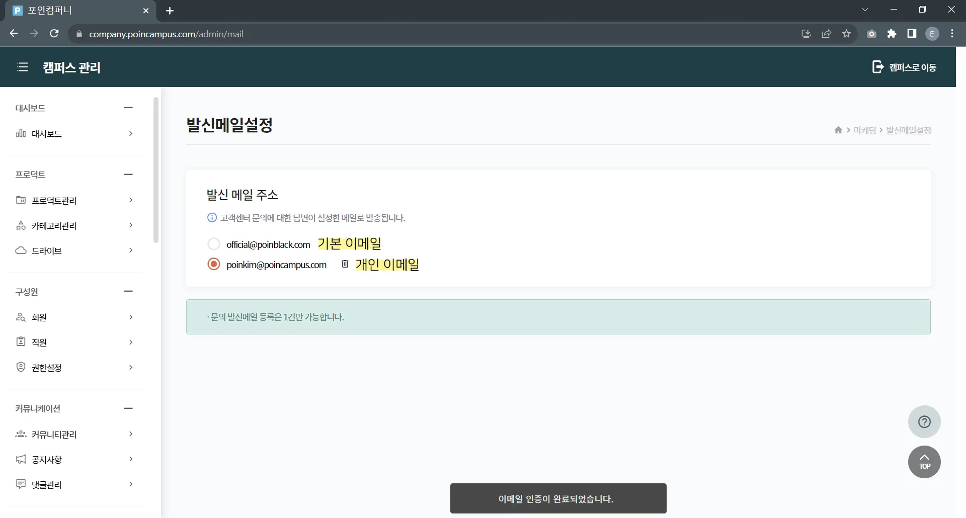 다시 발신메일설정으로 돌아와 기본 이메일과 개인 이메일 두 개가 뜨면 설정 완료입니다.