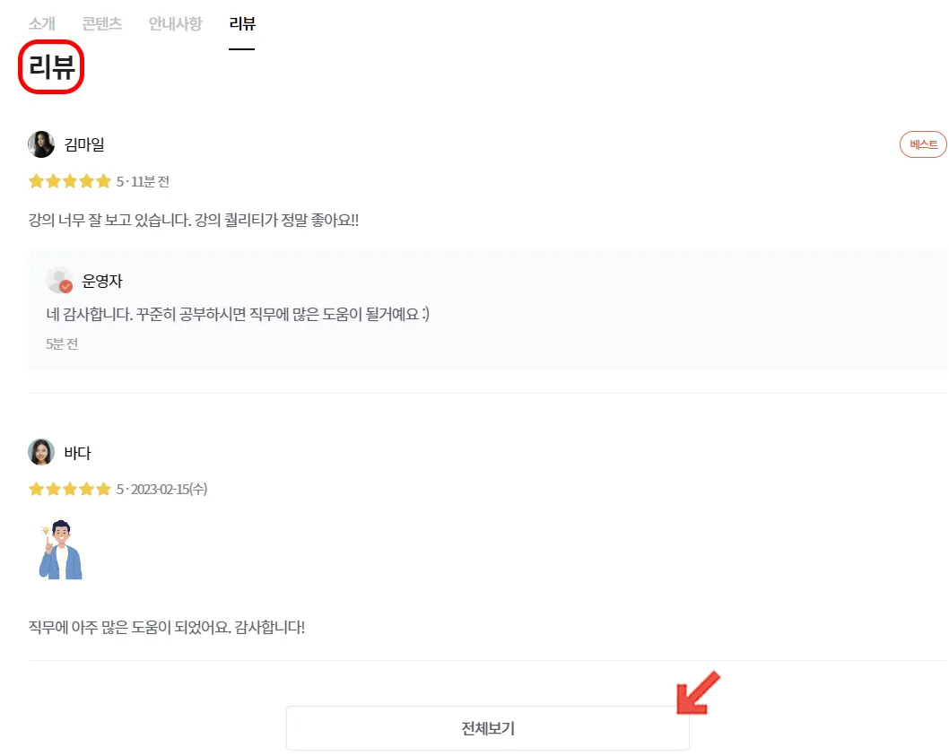 베스트 리뷰로 선정한 리뷰는 베스트로 표시되고, 전체보기 클릭 시 리뷰 전체 내용을 확인할 수 있어요.