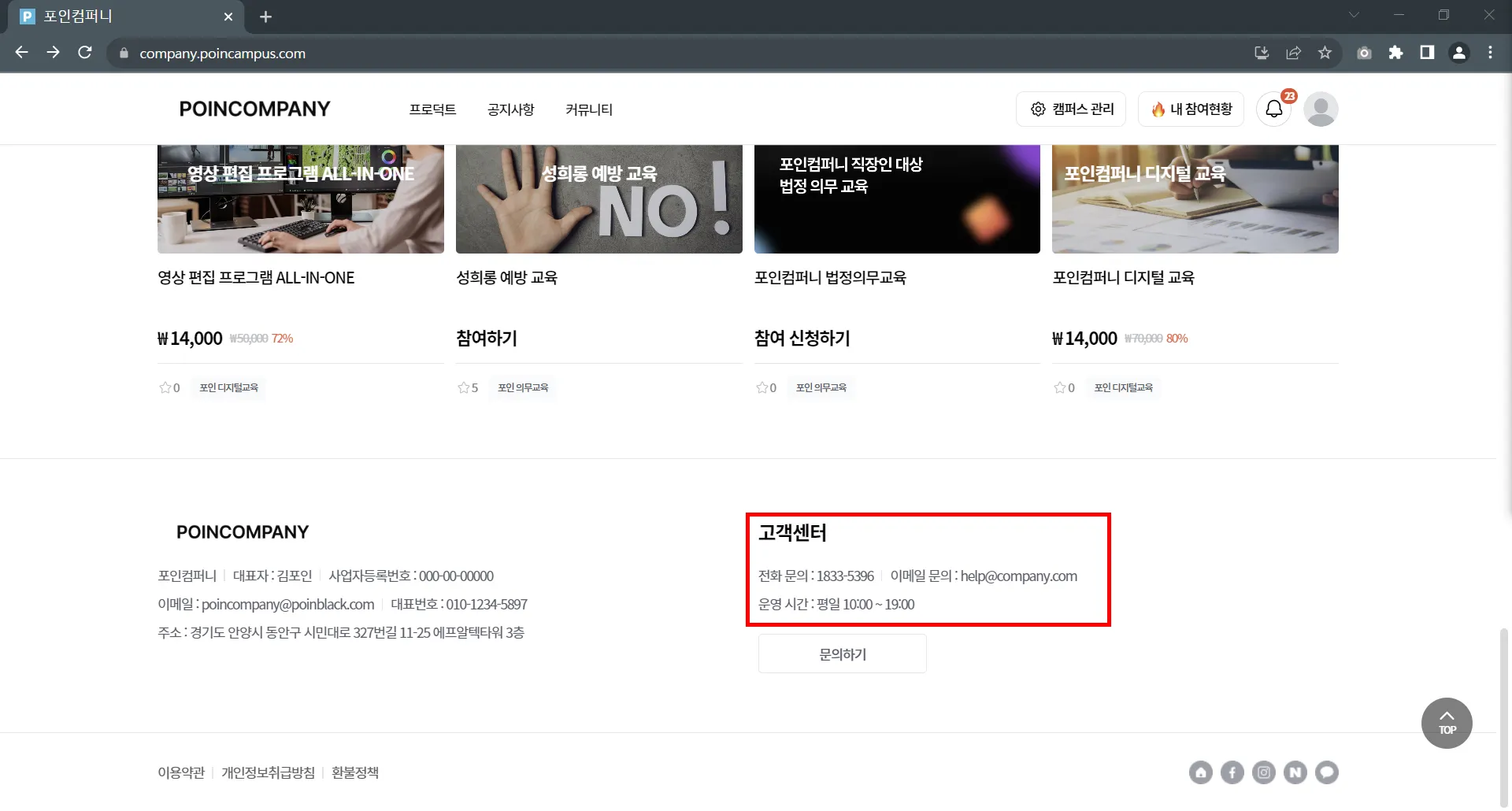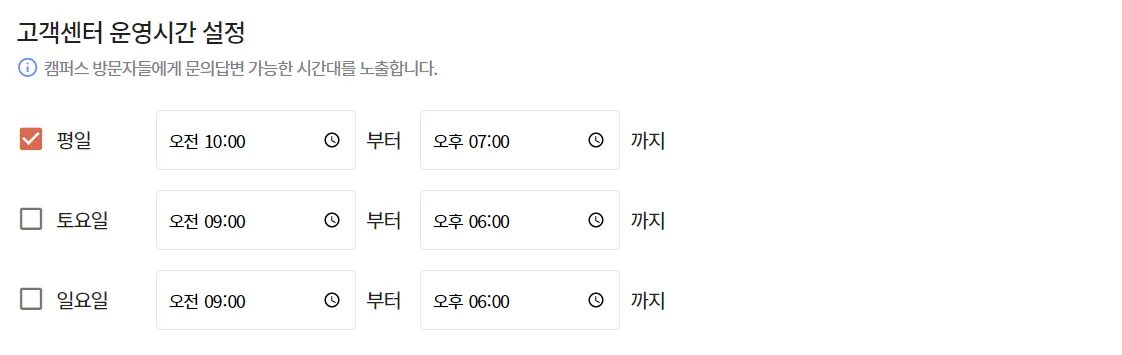 회원이 캠퍼스에 문의하면 개설자는 회원에게 답변을 하기 위해 캠퍼스 고객센터 정보 및 운영시간을 설정할 수 있습니다.