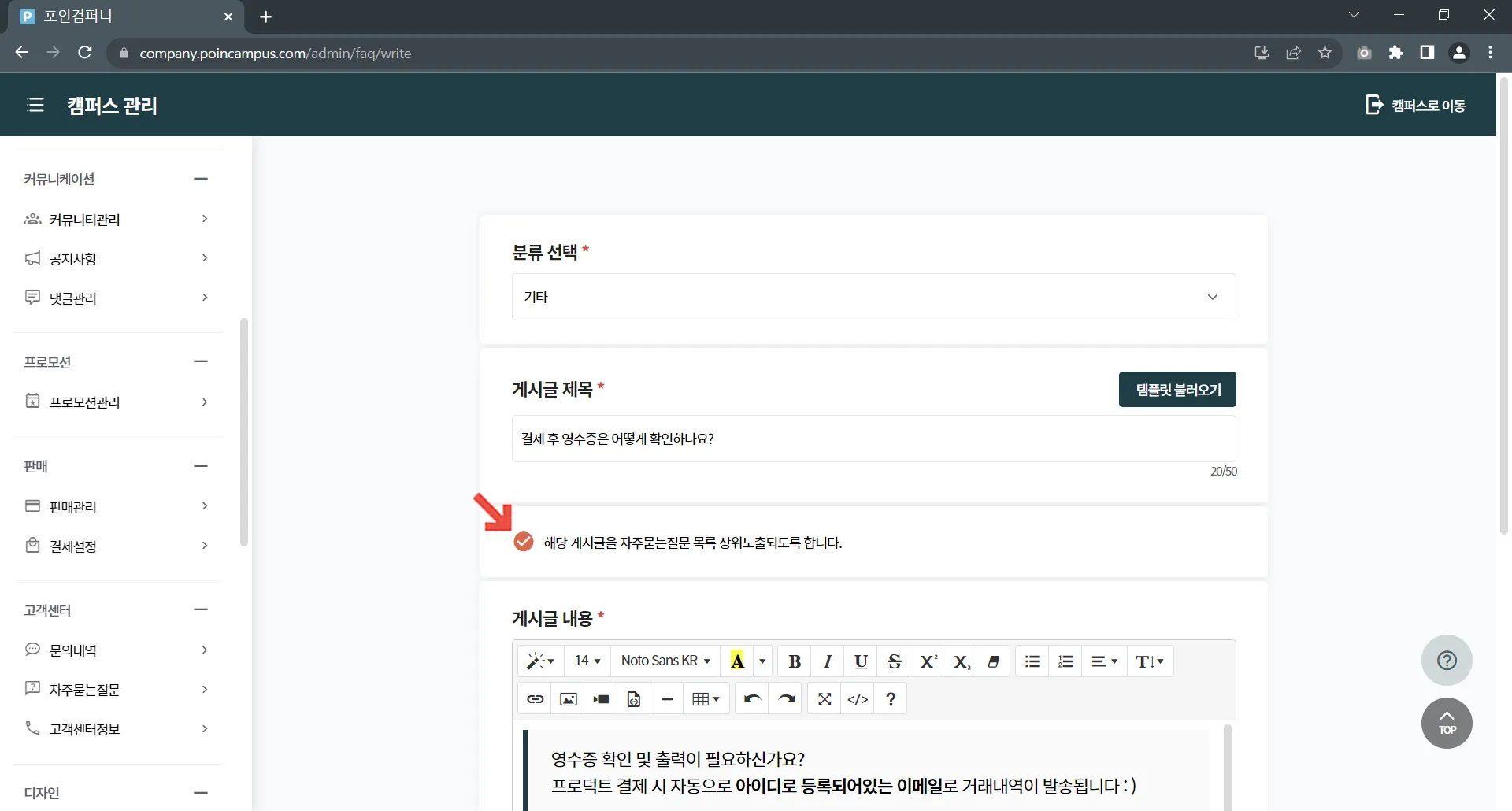 자주 묻는 질문 상위 노출에 체크한 게시글은 고정 아이콘이 표시돼요.