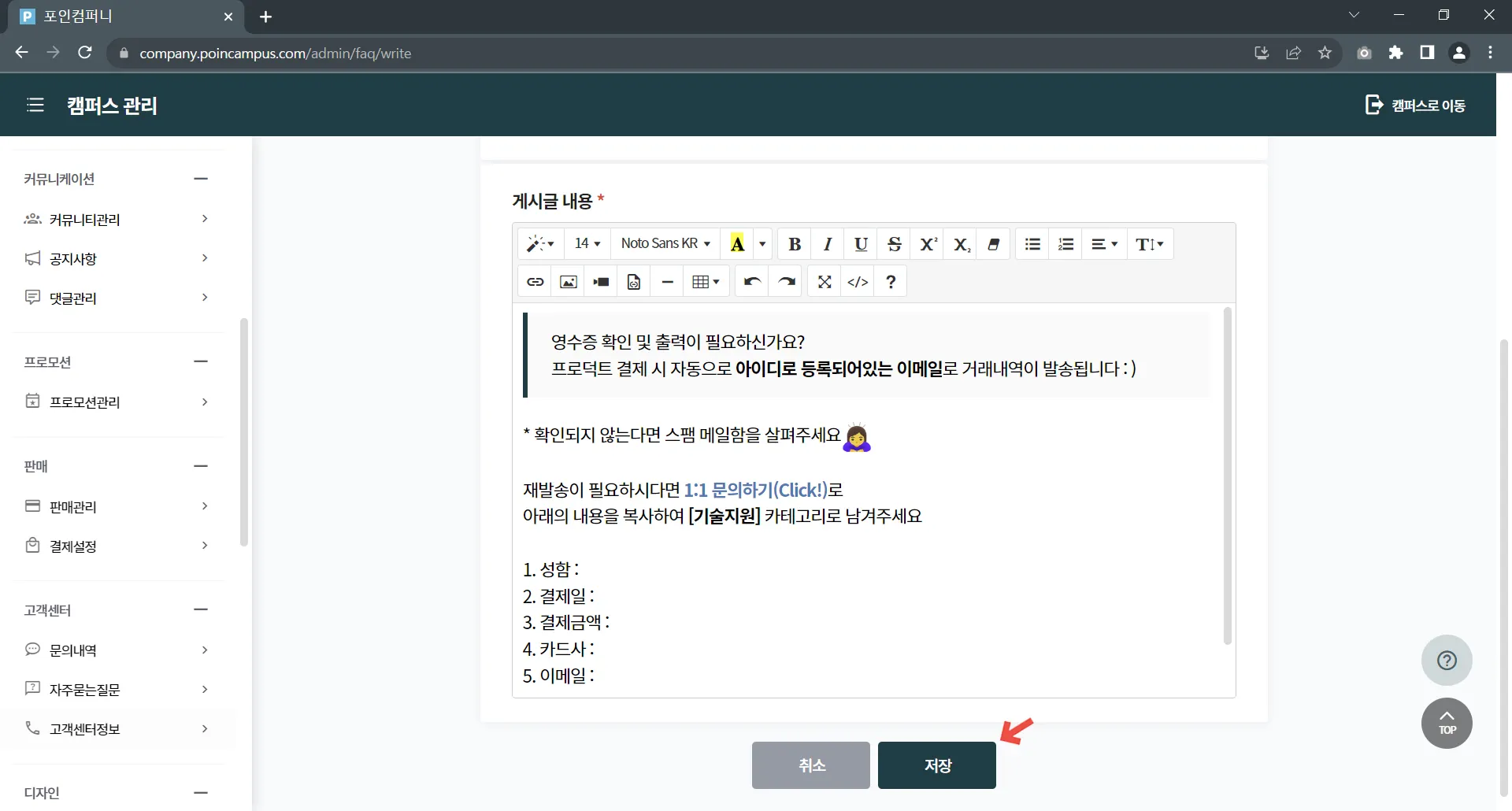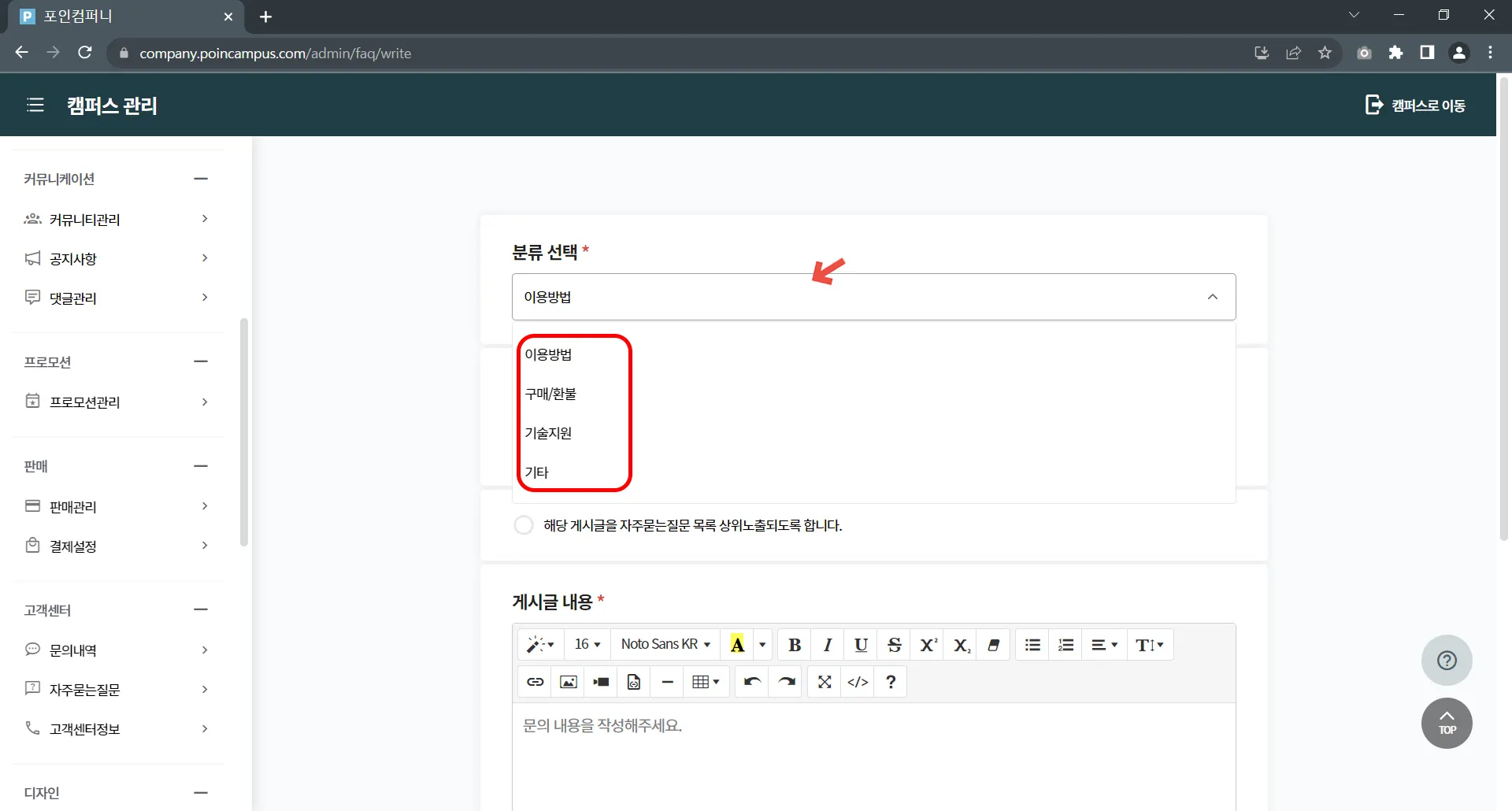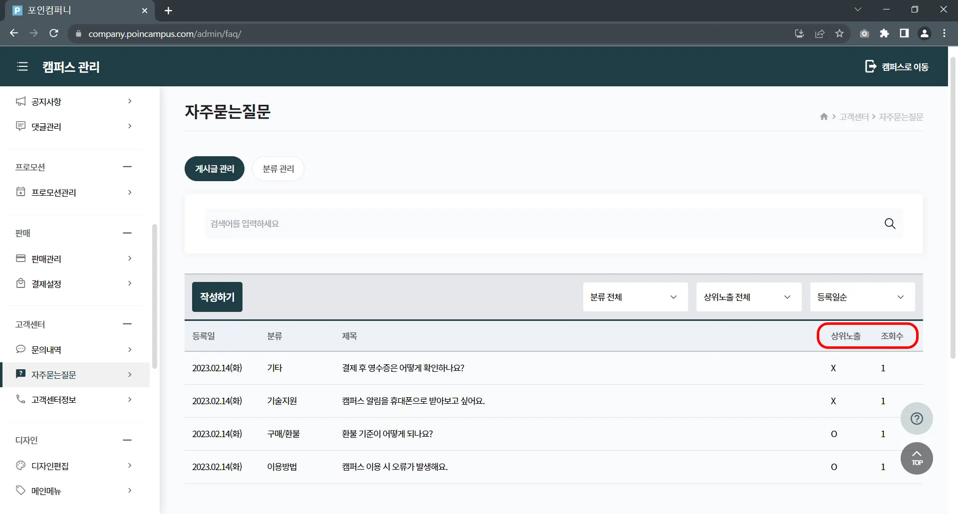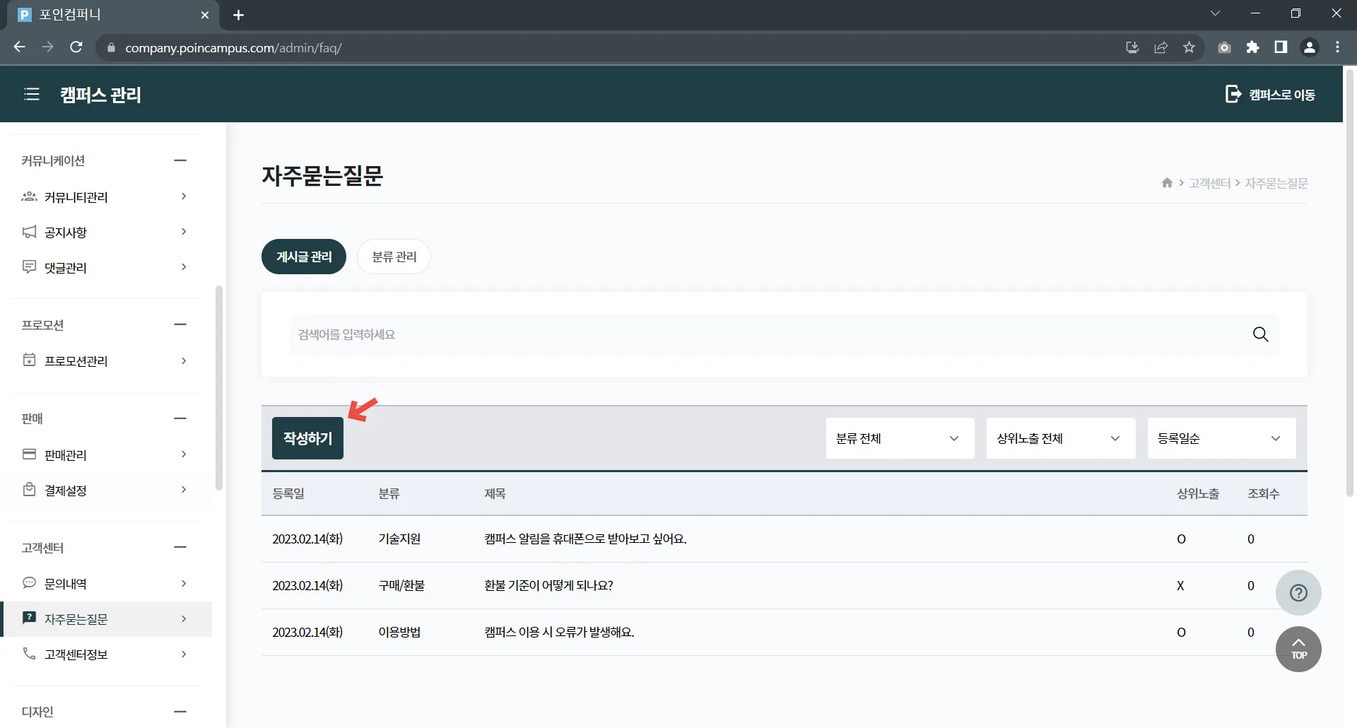캠퍼스 관리 > 고객센터 > 자주묻는질문을 클릭하여 게시글 관리 페이지로 접속해 주세요.