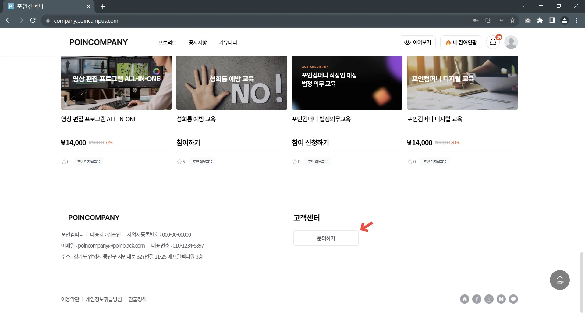 캠퍼스 메인 홈 하단 > 고객센터 아래에서 문의하기를 클릭하면 고객센터로 이동해요.