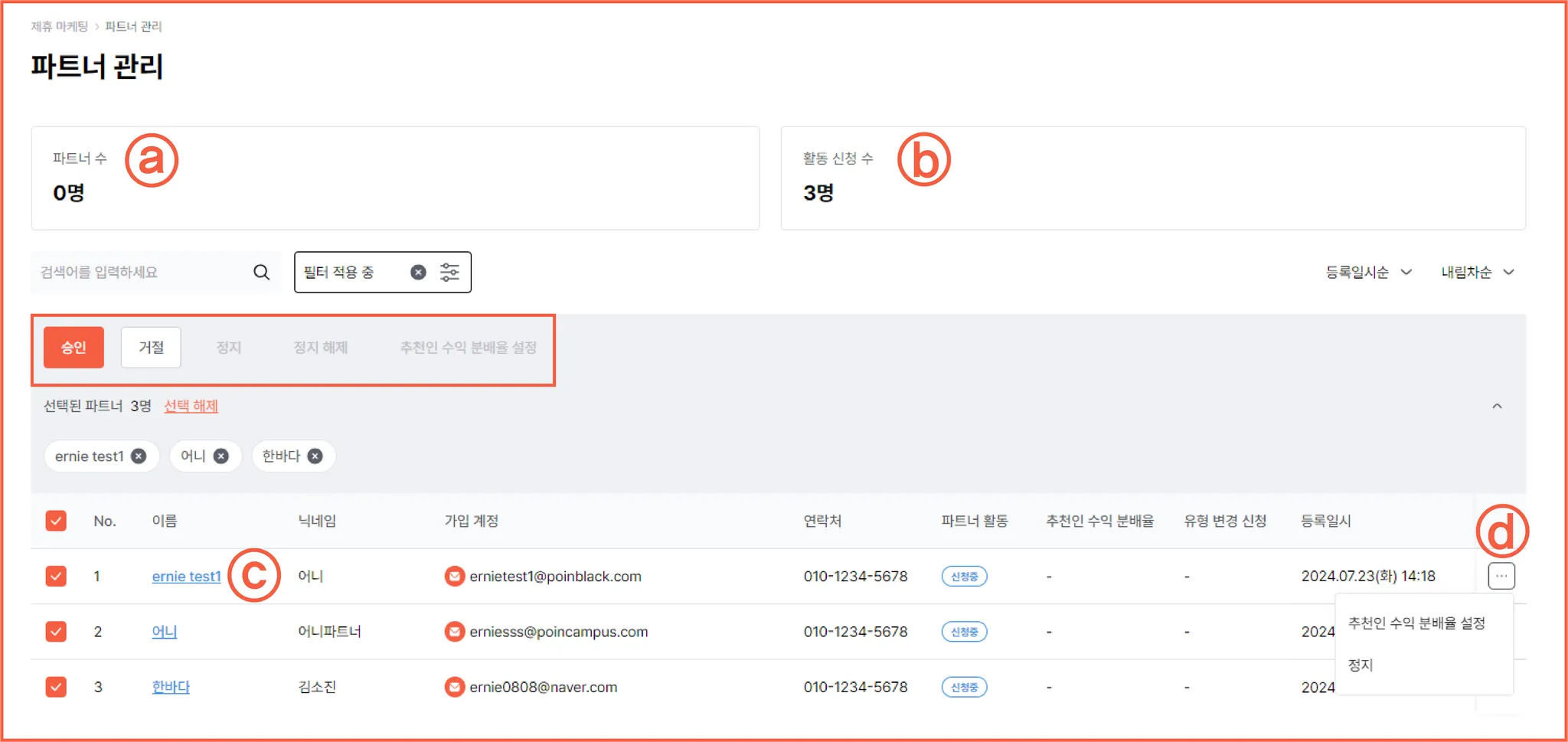 ⓑ 현재 파트너 활동을 신청한 수가 보여집니다.