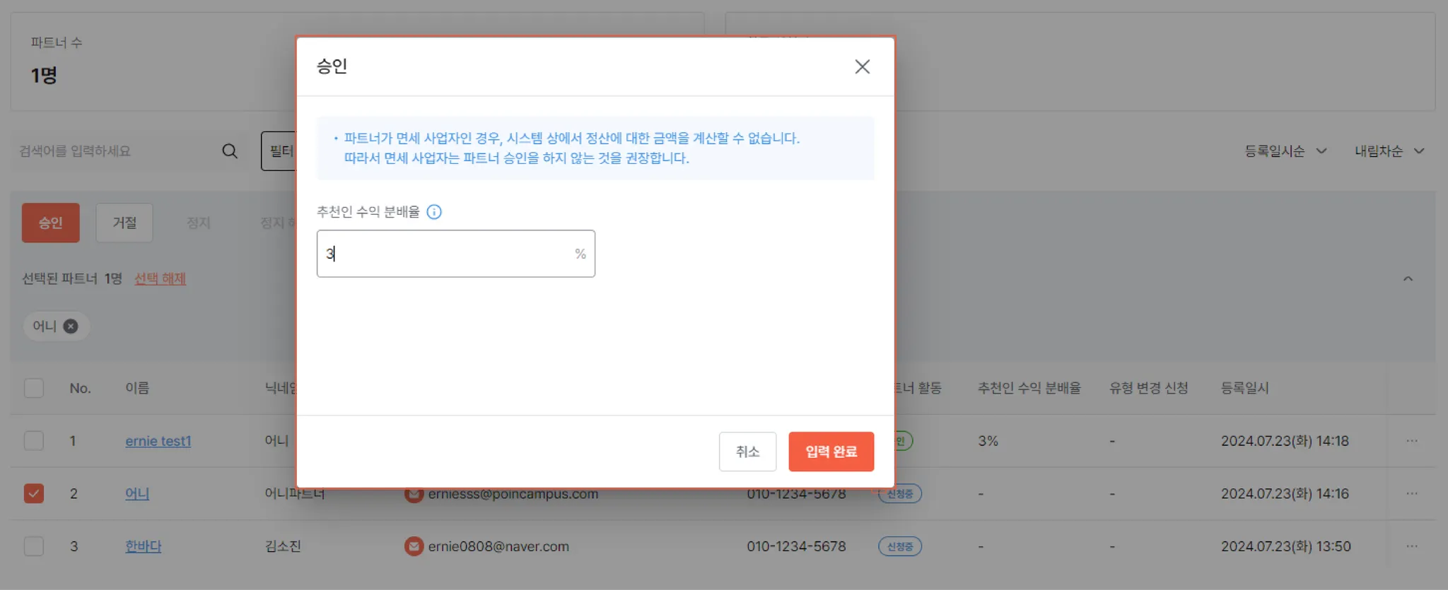 파트너 승인 시 ‘추천인 수익 분배율’을 설정합니다.