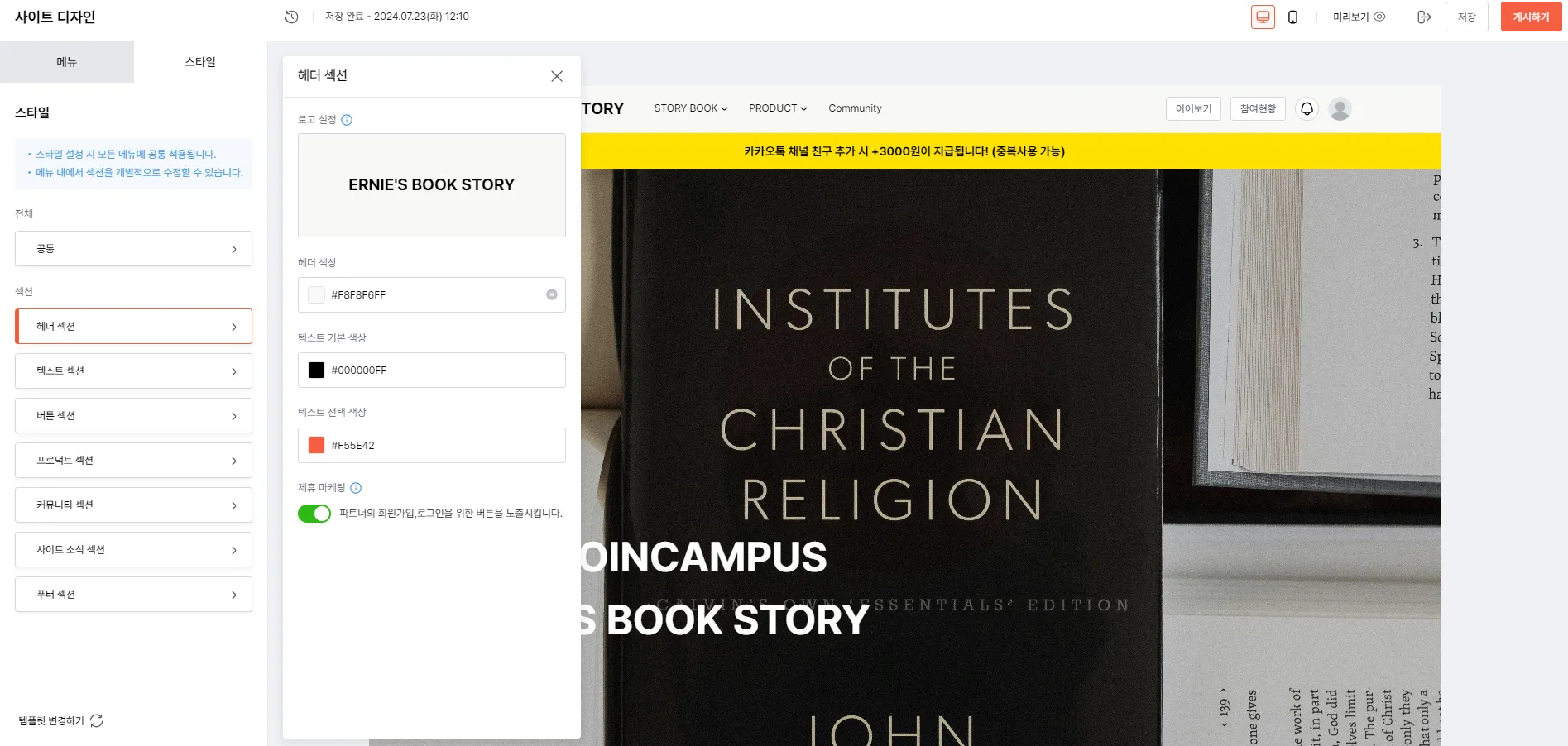 사이트 디자인 > [스타일] > 섹션 영역의 헤더 섹션 / 푸터 섹션 > ‘제휴 마케팅’ 버튼 활성화