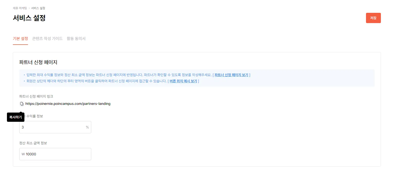 서비스 설정 > [파트너 신청 페이지]에서 링크 ‘복사하기’하여 파트너에게 전달할 수 있습니다.