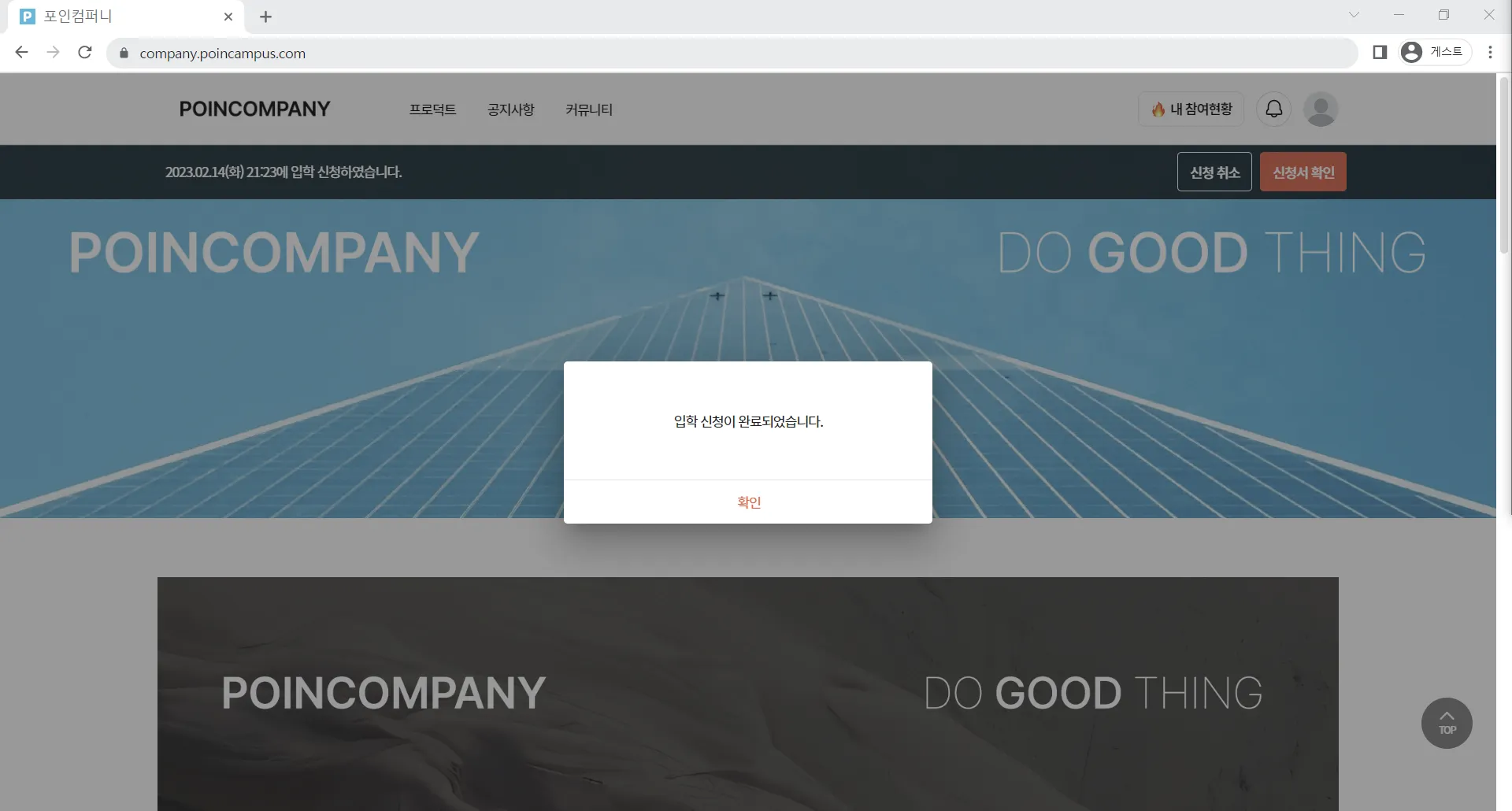 입학 신청 완료 팝업창이 뜨면 확인을 눌러주세요. 입학 신청이 완료됩니다.