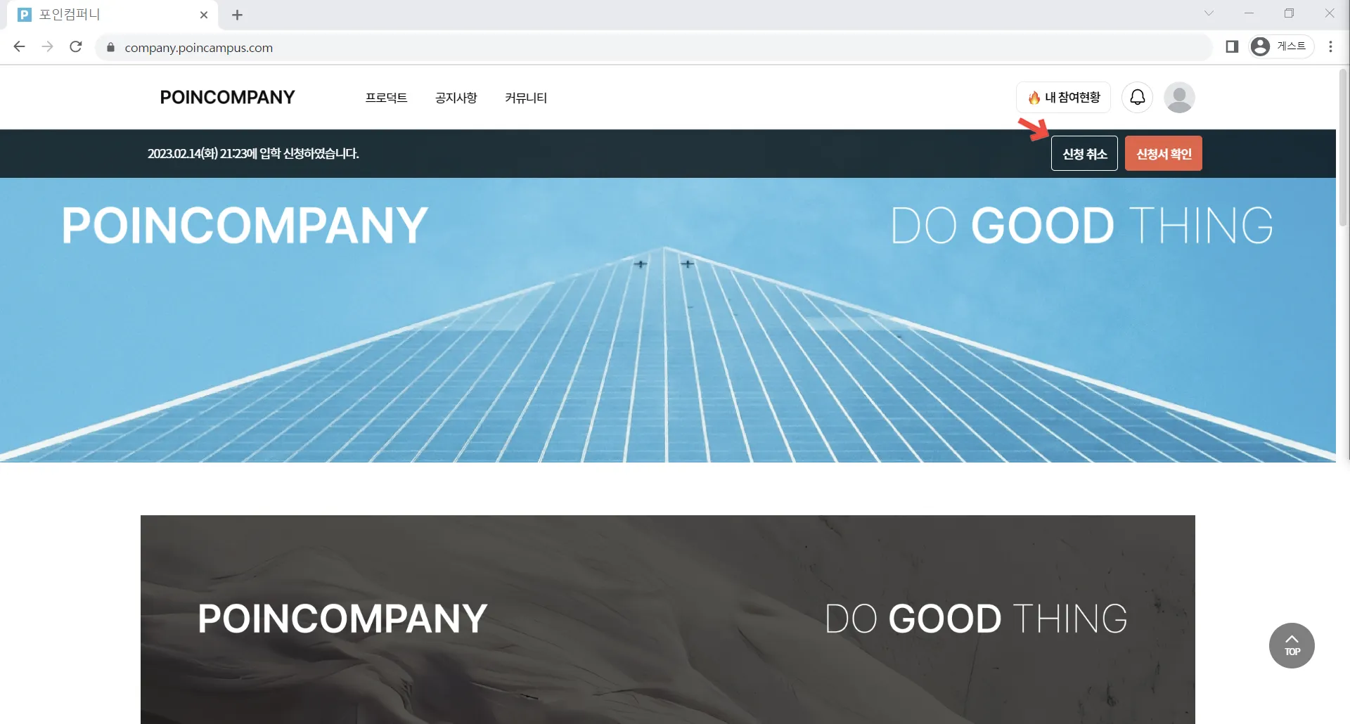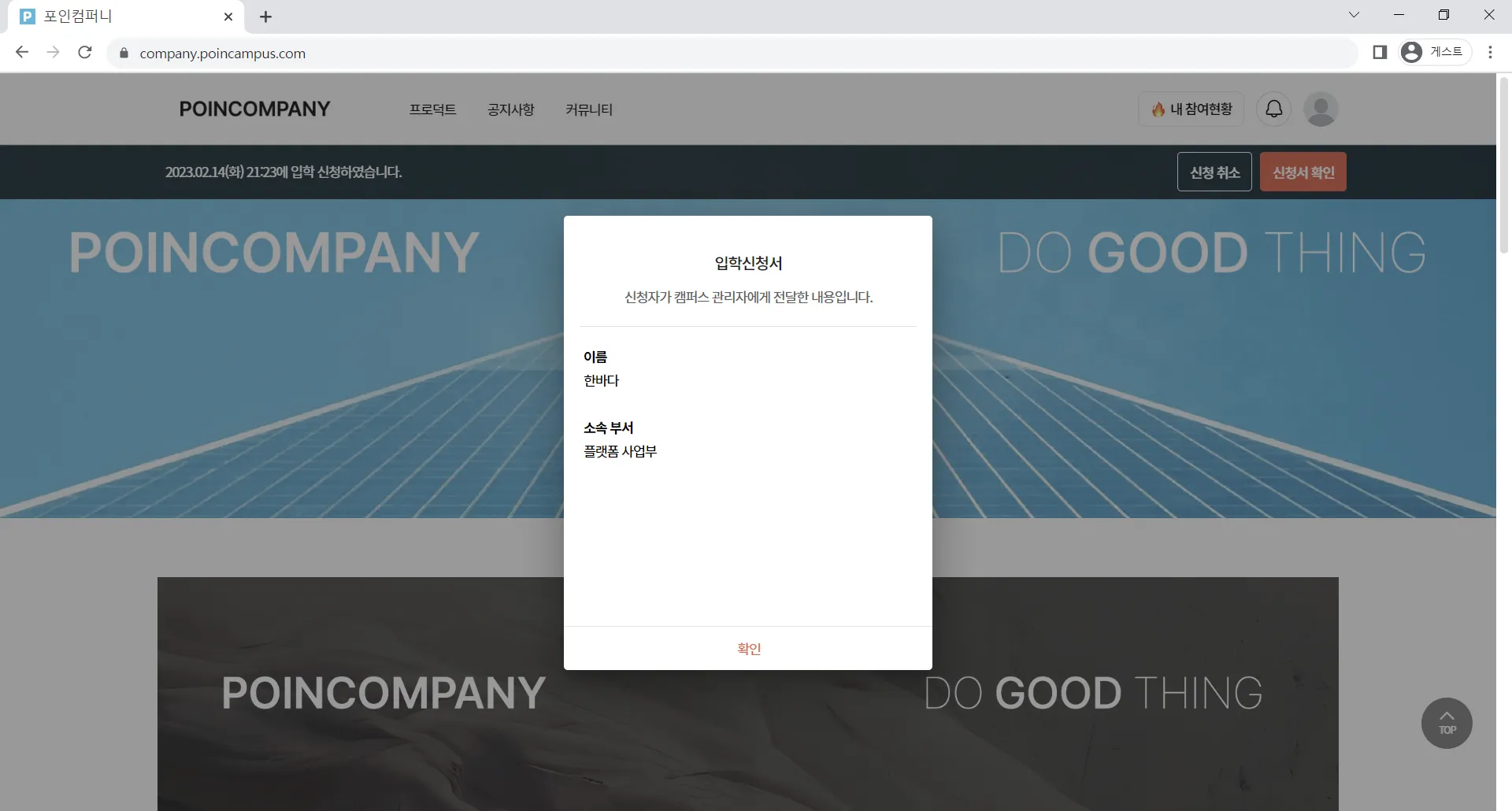 입학 신청 완료 시 캠퍼스 메인 홈 회원이 입학 신청한 날짜 및 시간을 확인할 수 있습니다.