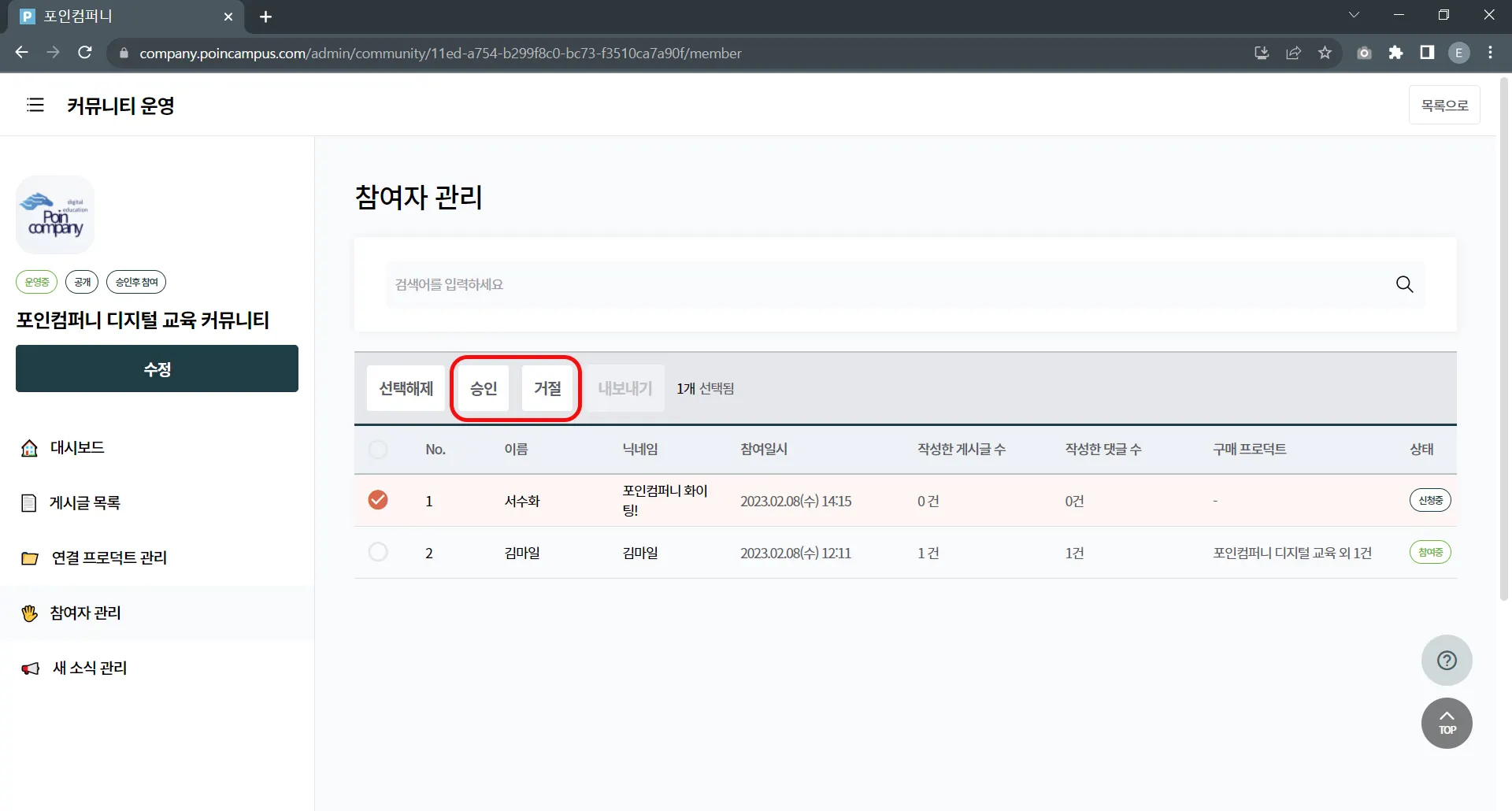 회원이 승인 후 참여 가능 커뮤니티에 참여 신청했을 때는, 개설자가 승인, 거절로 처리할 수 있습니다.