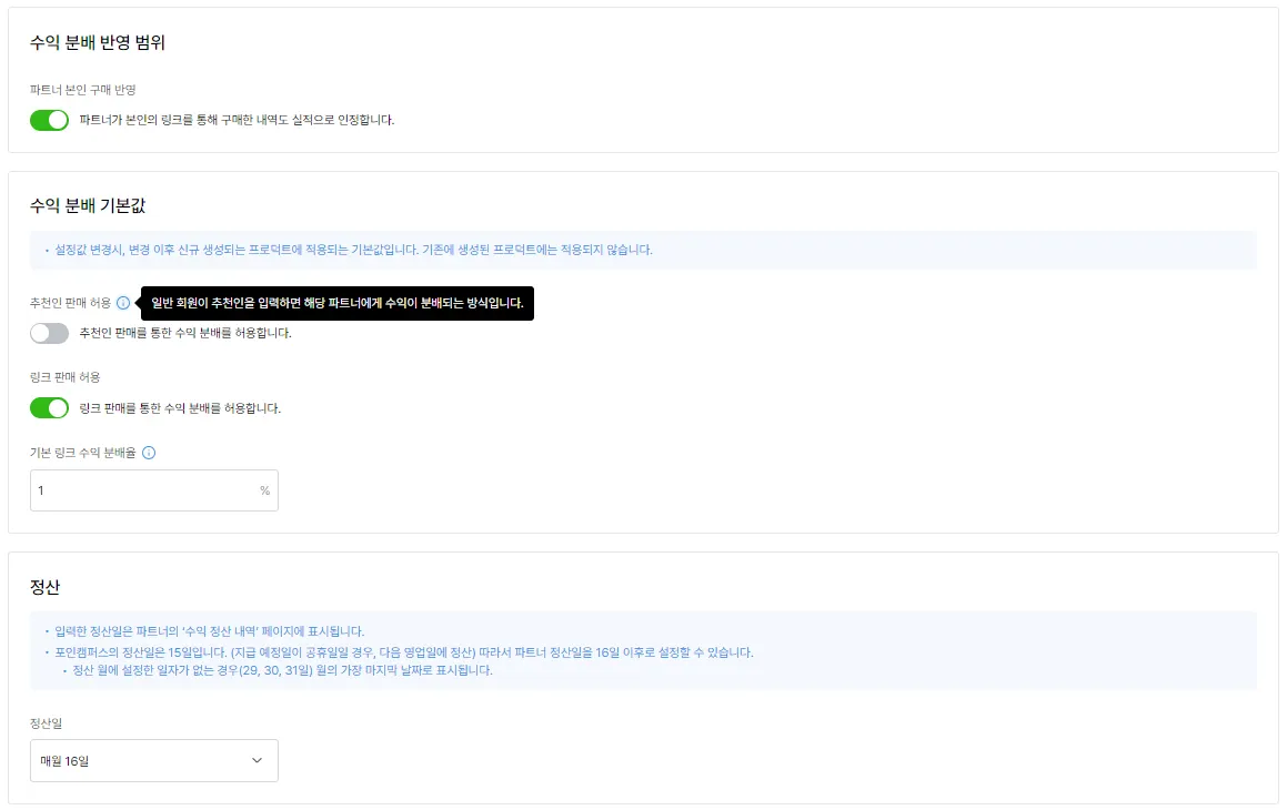 [수익 분배 기본값] > 추천인 판매 허용 / 링크 판매 허용 여부