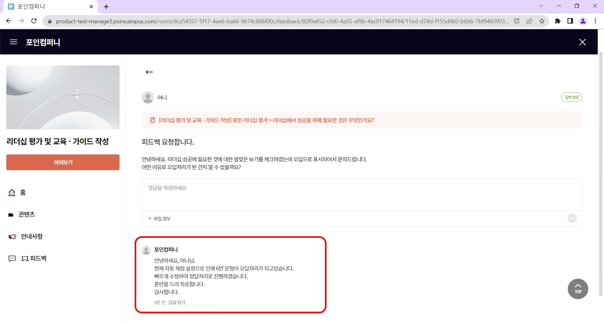 피드백 내용을 클릭 시 상세 피드백으로 이동하여 답변을 댓글로 확인할 수 있습니다.