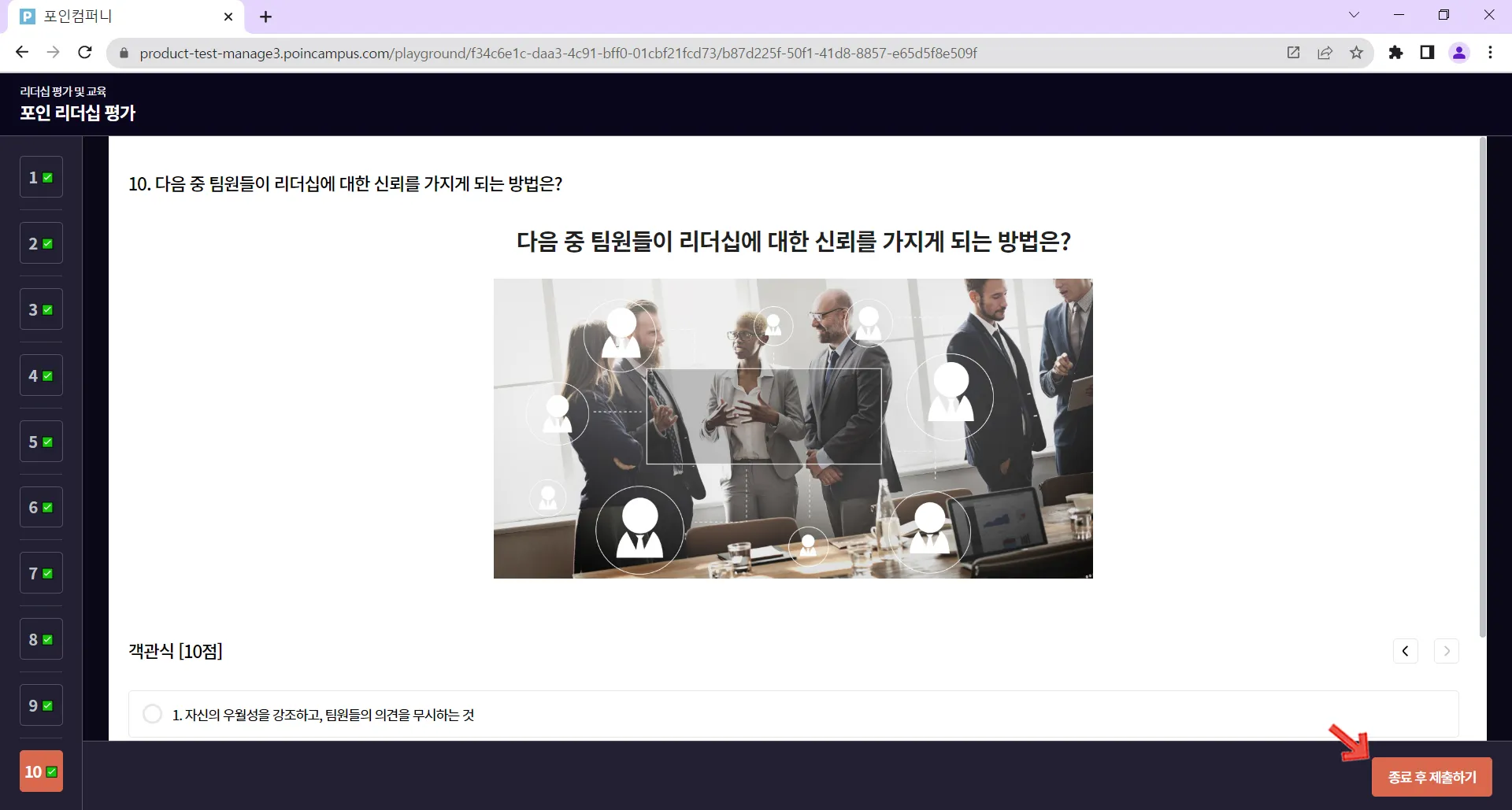 퀴즈 풀이가 끝나면 하단의 종료 후 제출하기를 클릭해 주세요.