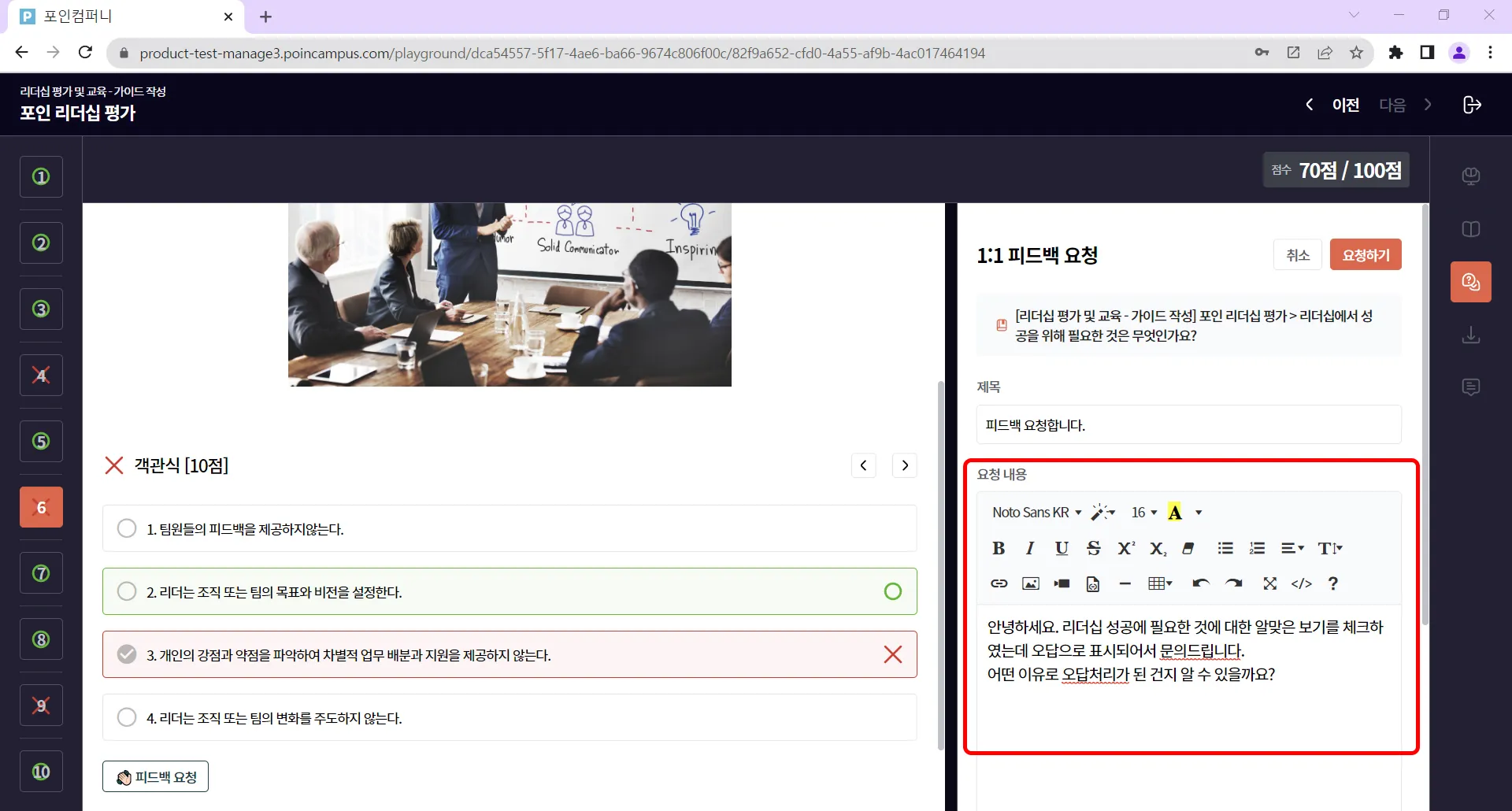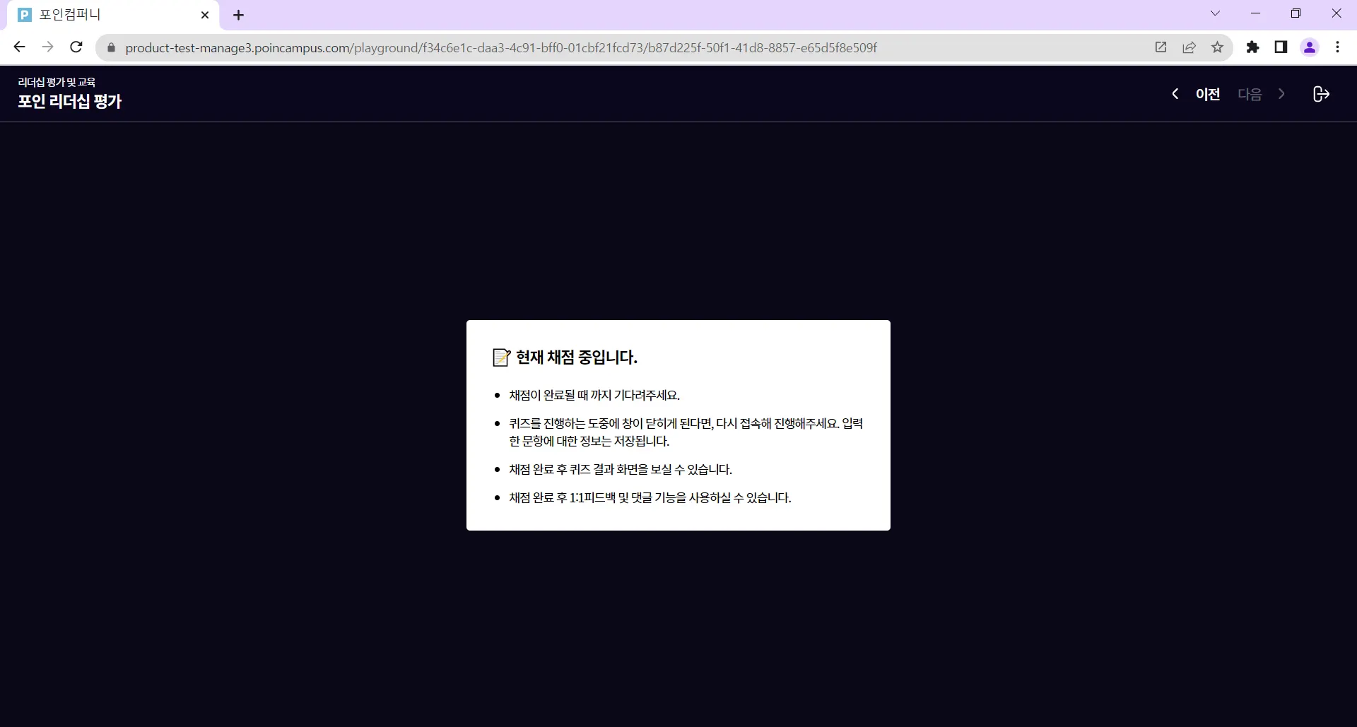 퀴즈 콘텐츠가 수동 채점으로 설정된 경우, 운영자의 채점하기 이후 채점 결과를 확인할 수 있습니다.