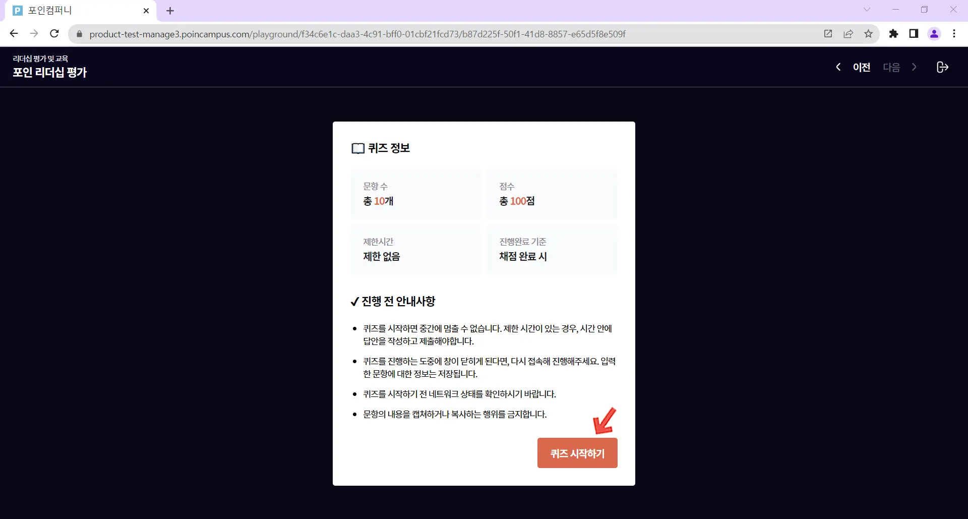 퀴즈 콘텐츠의 정보를 모두 확인한 후 퀴즈 시작하기를 클릭하여 퀴즈 풀이를 시작합니다.