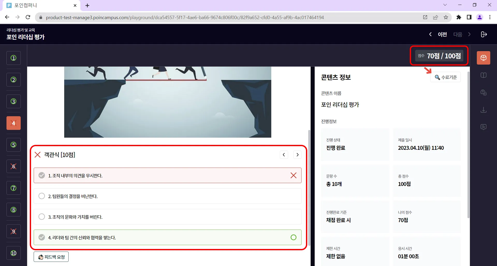퀴즈 콘텐츠가 자동 채점으로 설정된 경우, 채점 결과를 바로 확인할 수 있습니다.