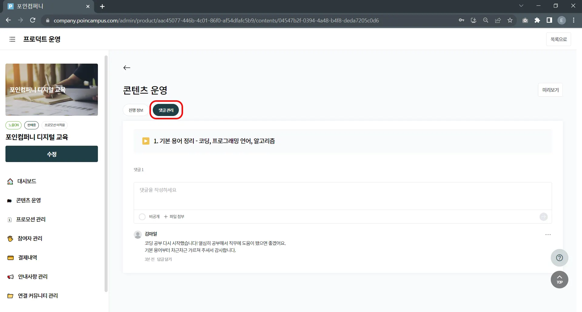각 콘텐츠에 작성된 댓글을 확인할 수 있고, 개설자는 댓글에 답글을 작성할 수 있습니다.