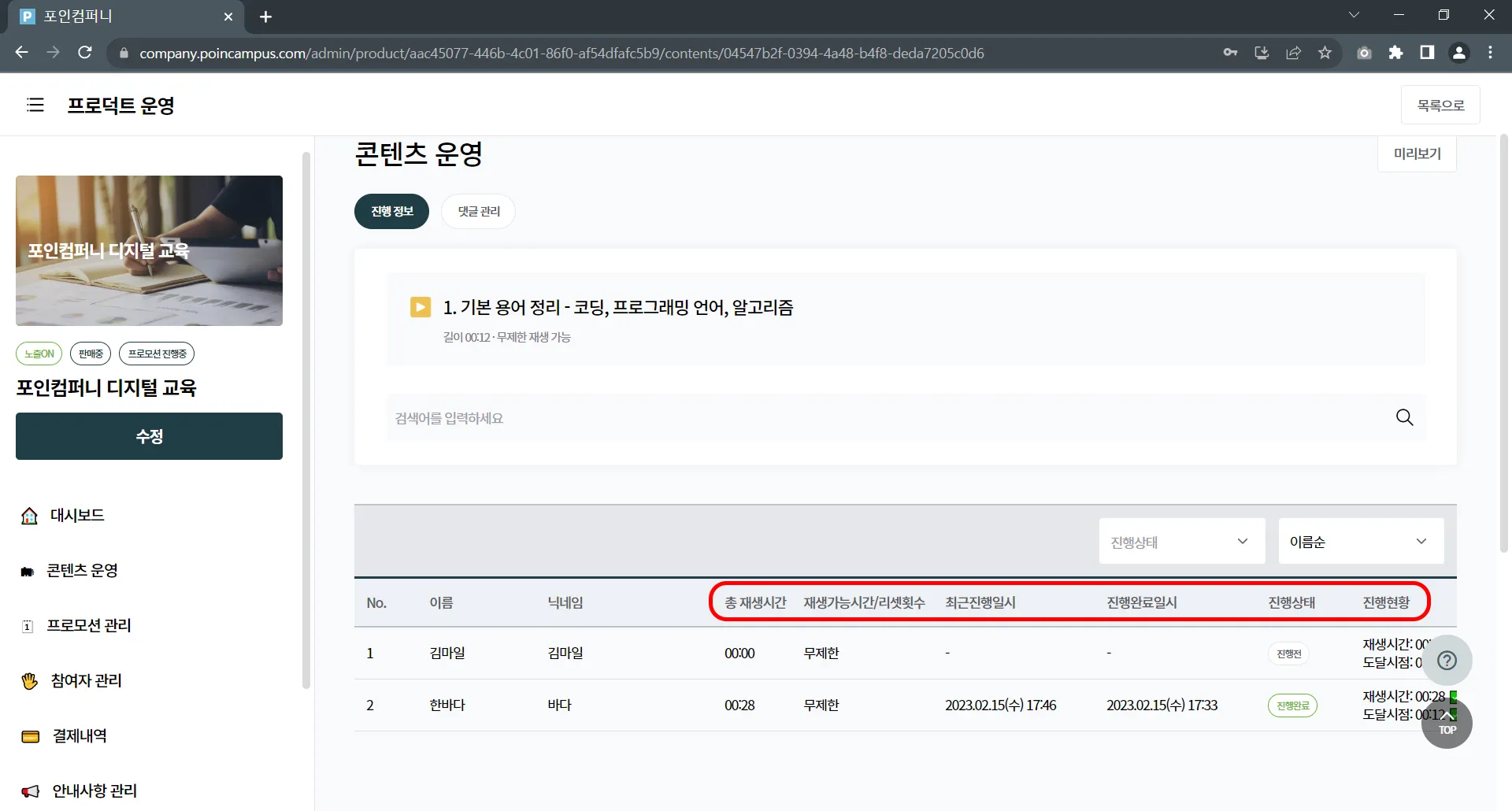 회원별 콘텐츠 진행 목록(재생시간, 진행상태, 진행현황 등)을 확인할 수 있습니다.