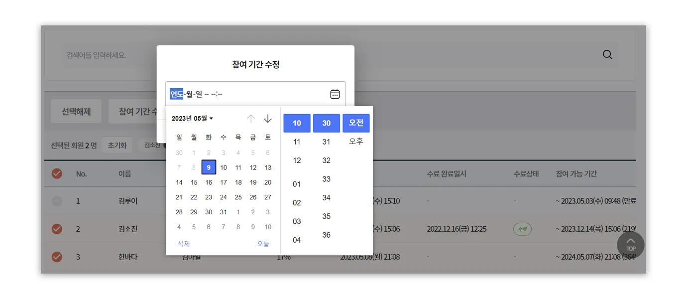 회원의 참여 기간을 캘린더를 통해 수정할 수 있습니다.