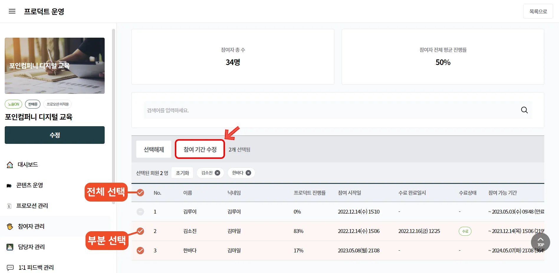 회원마다 강의 참여 기간은 같을 수도, 다를 수도 있습니다. 다른 경우 참여 기간을 한 명씩 수정하는 것 보다 전체 선택 또는 부분 선택하여 참여 기간을 일괄 수정하는 기능을 사용해 보세요.