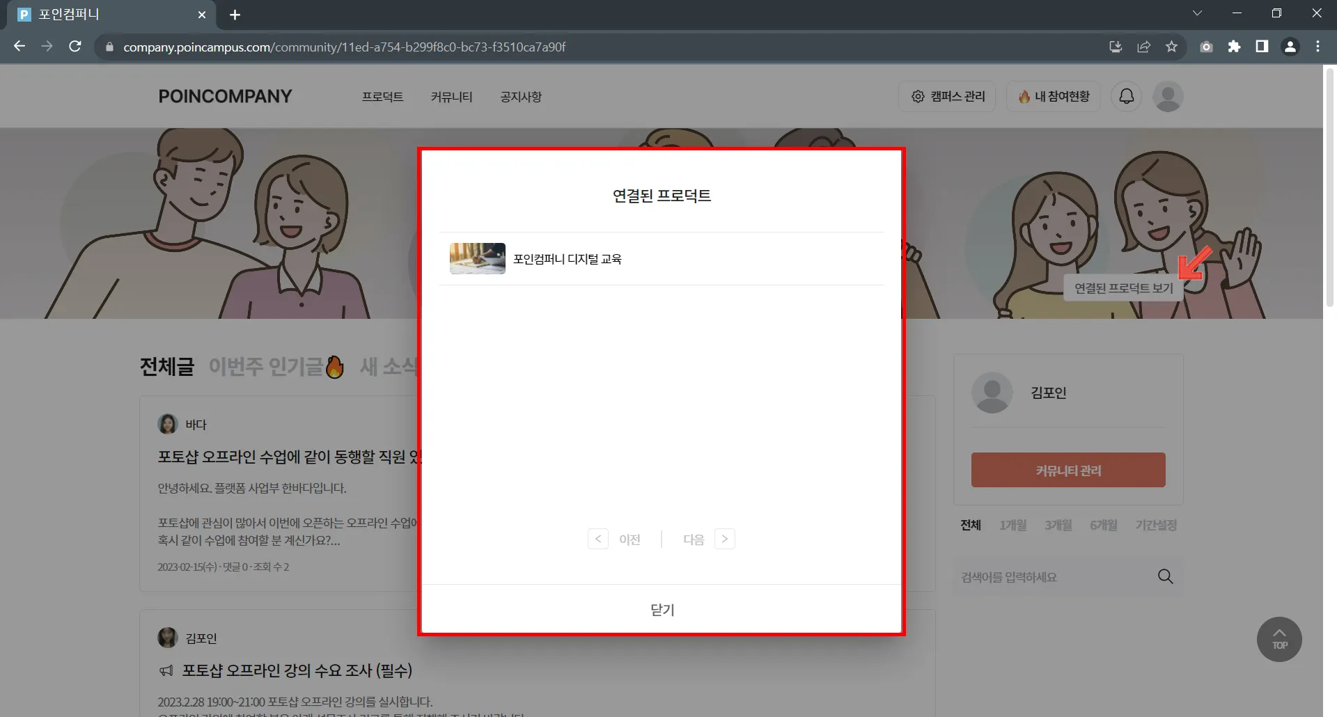 커뮤니티 상세페이지의 배너 이미지에서 연결된 프로덕트 보기를 클릭하면 커뮤니티에 연결된 프로덕트를 확인할 수 있어요.