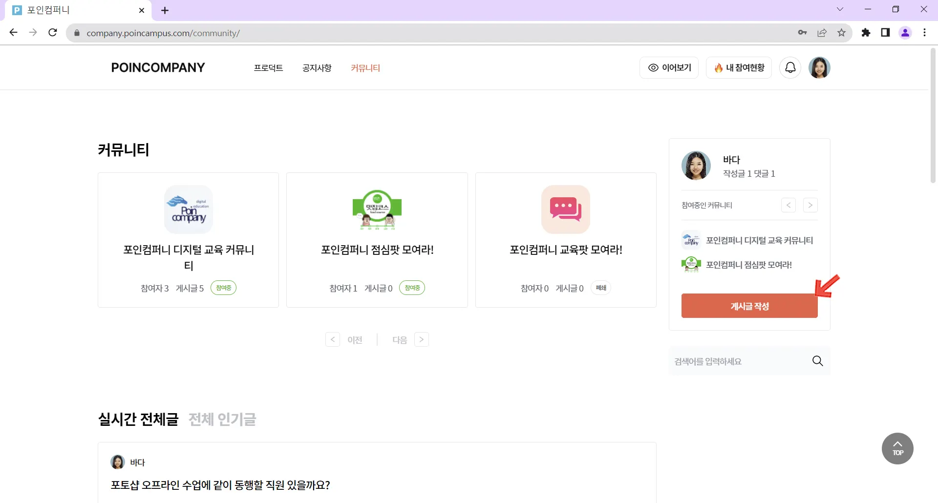커뮤니티 페이지에서 게시글 작성을 클릭해 주세요.