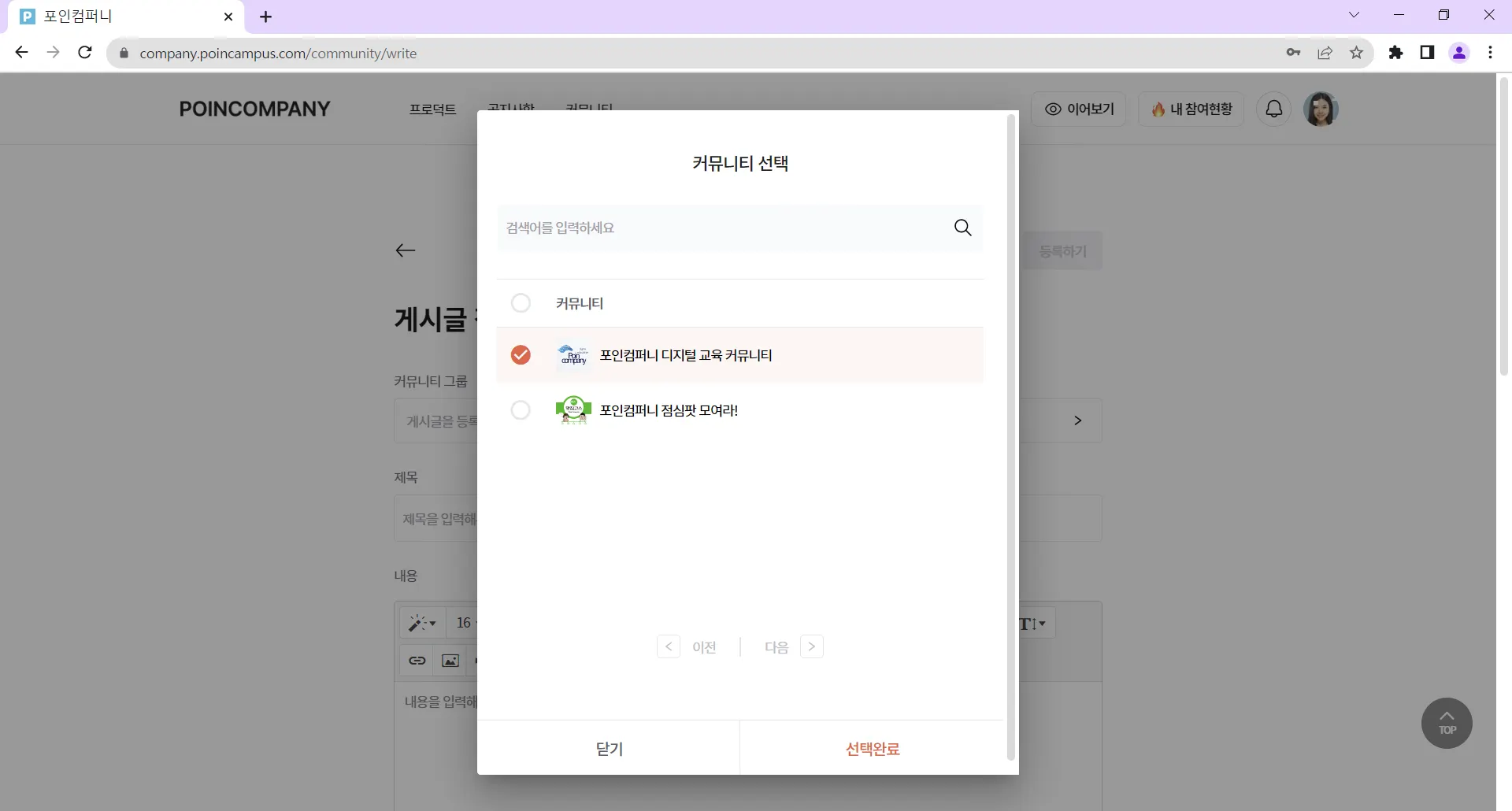 여러 커뮤니티에 참여했다면 게시글을 올릴 커뮤니티를 선택해 주세요.