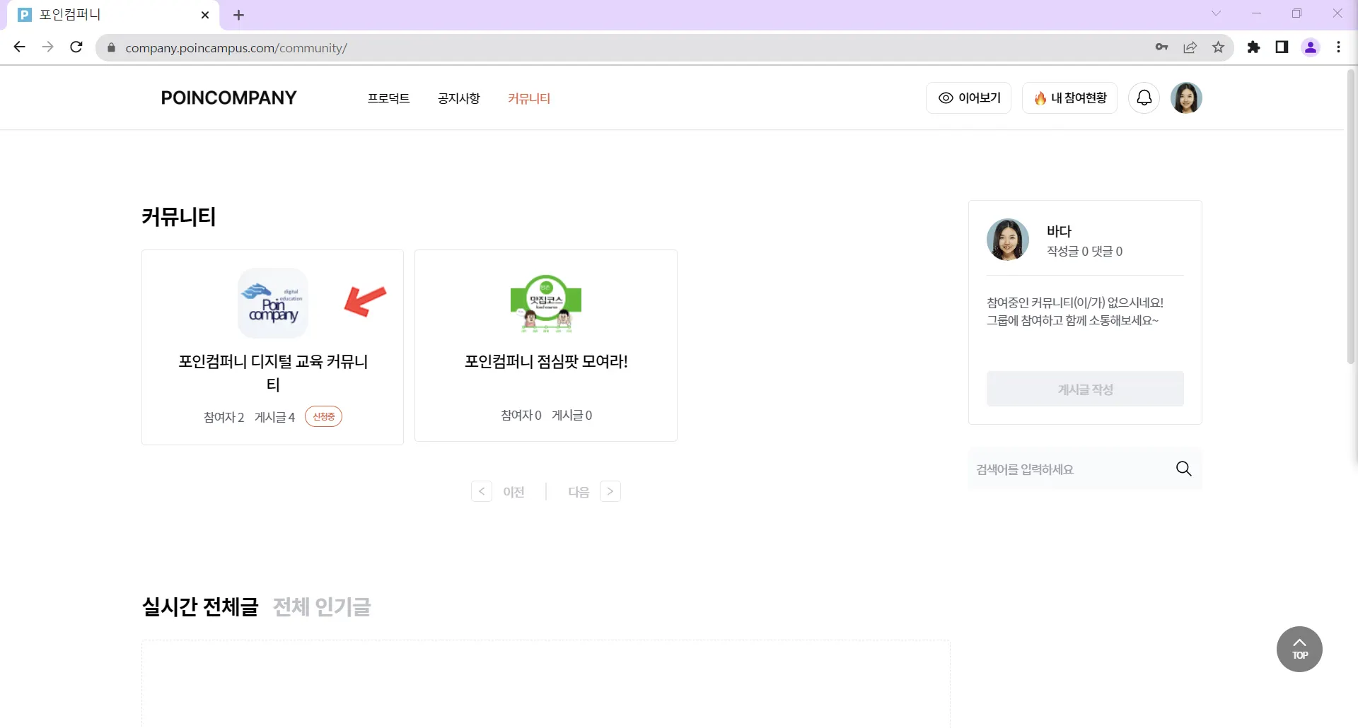 하단의 실시간 전체글 및 전체 인기글을 확인할 수 있습니다.