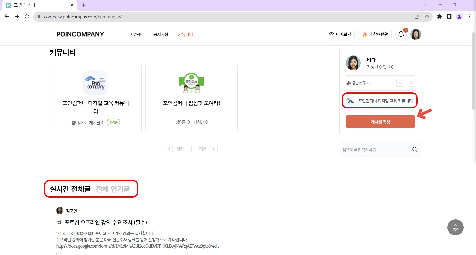 커뮤니티에 입장하지 않아도 커뮤니티 목록에서 게시글을 작성할 수 있고,