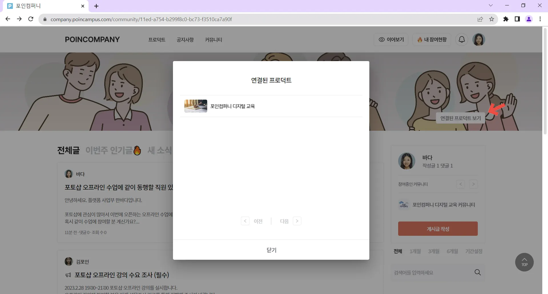 참여한 커뮤니티가 어떤 프로덕트와 연결되어 있는지 확인할 수 있습니다.