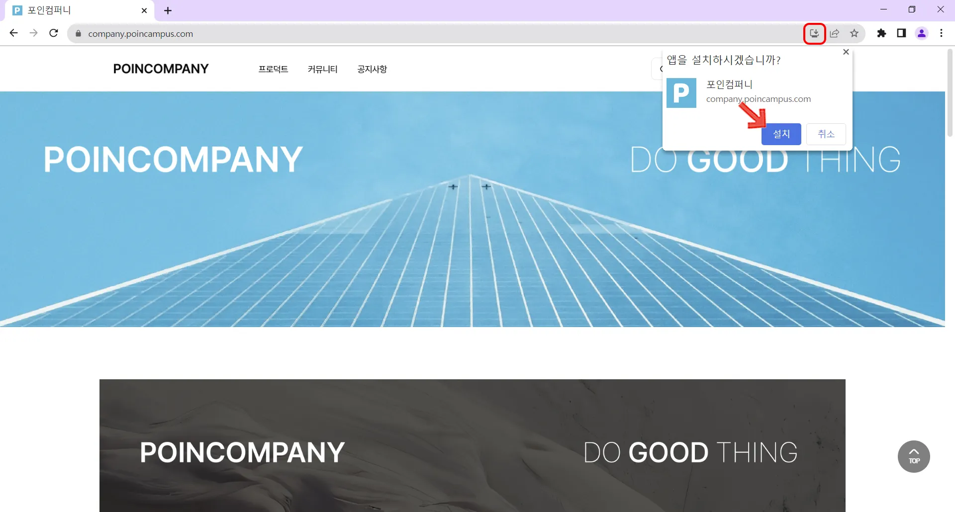 브라우저 상단에 설치 팝업창이 표시되면 설치 버튼을 클릭해 주세요.