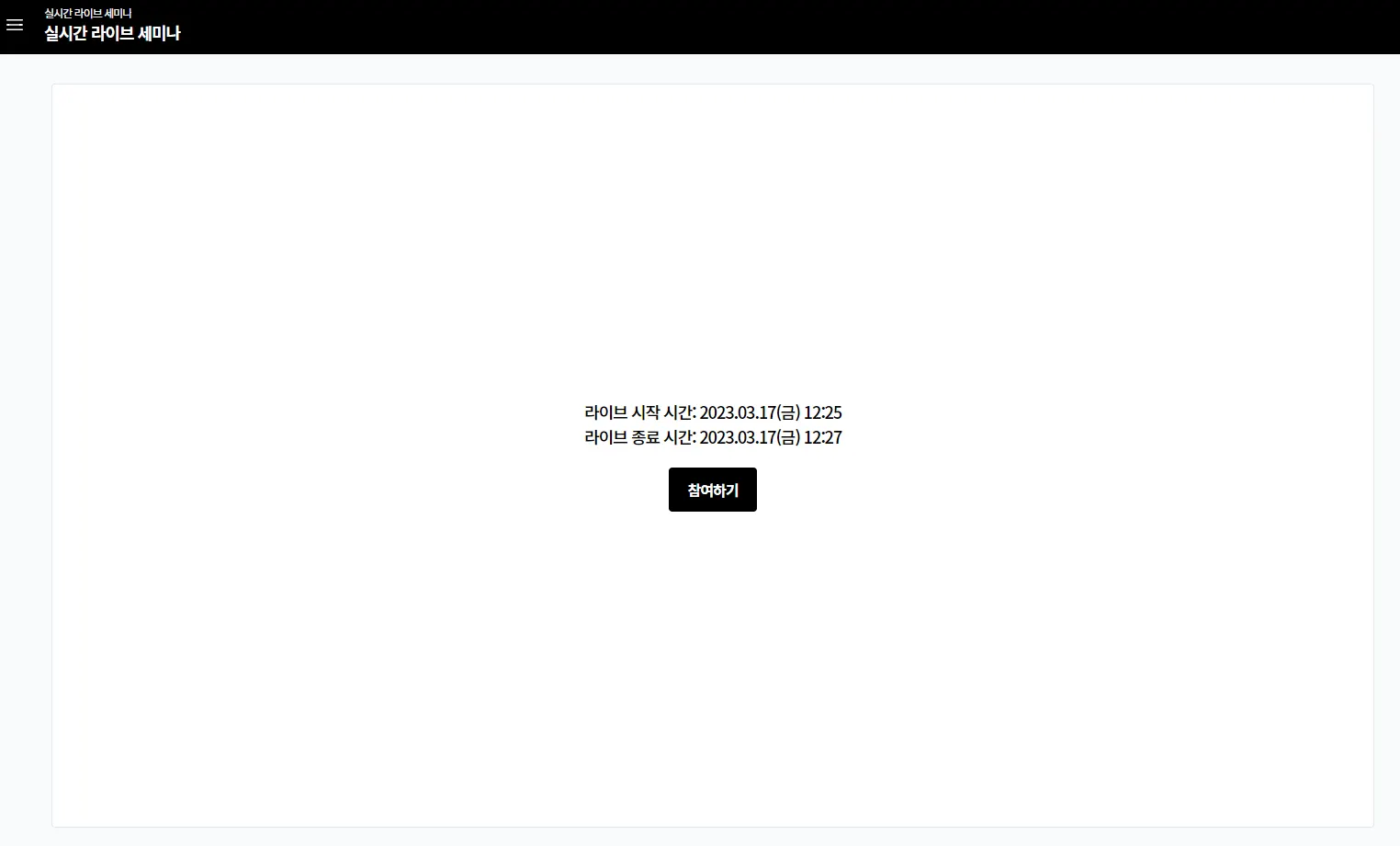 강의자(혹은 개설자)가 라이브 시작하기를 누르면, 화면은 위 이미지와 같이 표시됩니다. 시작 및 종료 시간 아래에 참여하기를 클릭하면 라이브 링크로 접속됩니다.